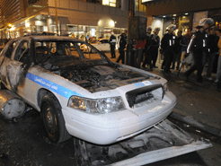 L’escouade anti-émeute et les pompiers ont dû intervenir rue Sainte-Catherine au centre-ville de Montréal. Au moins 16 voitures de police ont été endommagées et 5 ont été incendiées.