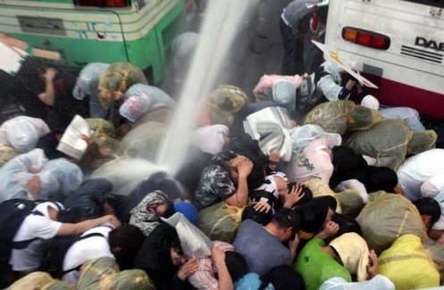 Numerous peaceful protesters were injured by the riot police who indiscrimately fired water cannon over the crowd chanting « Down with US beef import » and « Down with President Lee Myung-Bak. »