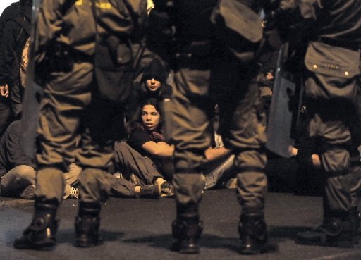 The violence came after thousands of mostly students and workers through the streets of the capital beating drums and chanting slogans such as « Education, Security, Work », guarded by about 6,000 police officers, many in full riot gear.