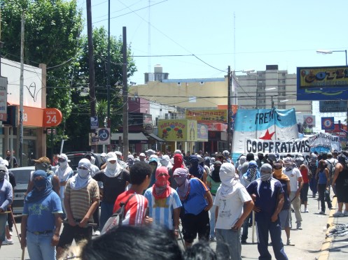 “Fuimos reprimidos por la policía injustamente, porque estamos solicitando puestos de trabajo. Una delegación se encontraba dialogando con miembros de la Municipalidad y, en ese momento, la policía comenzó a tirar balas de goma y pegarle a los compañeros, muchos de ellos eran mujeres embarazadas y niños”, relató Ayelén, miembro del Frente Popular Darío Santillán, en diálogo con Info Región. Y agregó: “Organizamos un banderazo porque queremos que los compañeros sean liberados rápidamente y nos quedaremos en este lugar hasta que recuperen la libertad”.