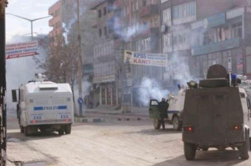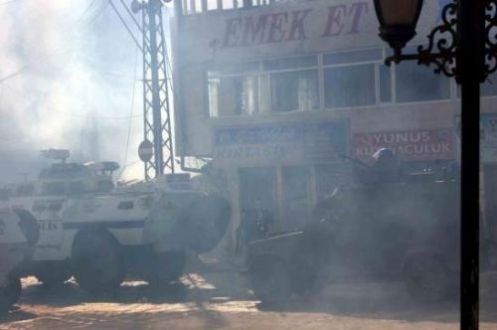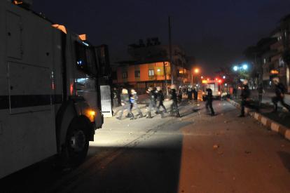 Ateş yakıp sloganlar atan ve yollara barikat kuran 30 kişinin dağılması için polis uyarılar yaptı. Uyarılara rağmen dağılmayan göstericiler polise taşla karşılık verdi. Bunun üzerine polis, göstericelere gaz bombaları ve tazyikli suyla müdahale etti. Çıkan olaylarda bazı bankaların camları da göstericiler tarafından atılan taşlarla kırıldı.Bu arada bayramın dördüncü günü olması nedeniyle kent merkezinde açık olan bazı işyerleri de çıkan olaylar yüzünden kepenklerini kapatmak zorunda kaldı. Geniş güvenlik önlemlerinin alındığı ilçede olaylar ara sokaklarda devam etti.