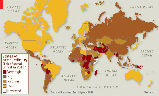 The Economist says that 2010 could be a year the sparks unrest in the Global Tinderbox: “IF THE world appears to have escaped relatively unscathed by social unrest in 2009, despite suffering the worst recession since the 1930s, it might just prove the lull before the storm. Despite a tentative global recovery, for many people around the world economic and social conditions will continue to deteriorate in 2010. An estimated 60m people worldwide will lose their jobs. Poverty rates will continue to rise, with 200m people at risk of joining the ranks of those living on less than $2 a day. But poverty alone does not spark unrest—exaggerated income inequalities, poor governance, lack of social provision and ethnic tensions are all elements of the brew that foments unrest.“