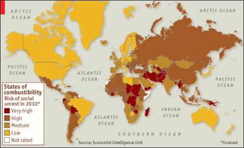 IF THE world appears to have escaped relatively unscathed by social unrest in 2009, despite suffering the worst recession since the 1930s, it might just prove the lull before the storm. Despite a tentative global recovery, for many people around the world economic and social conditions will continue to deteriorate in 2010. An estimated 60m people worldwide will lose their jobs. Poverty rates will continue to rise, with 200m people at risk of joining the ranks of those living on less than $2 a day. But poverty alone does not spark unrest—exaggerated income inequalities, poor governance, lack of social provision and ethnic tensions are all elements of the brew that foments unrest.
