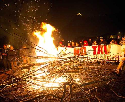 Il gran finale di una giornata difficile arrivava alle 18.30, quando circa 500 No Tav impedivano il cambio turno alle forze dell’ordine e, in contemporanea, bloccavano la statale 25. Partiva poi un corteo, con l’intento di raggiungere la trivella passando dai campi. Giunti a 50 metri dall’obiettivo, dei manifestanti “armati” di motoseghe abbattevano alberi e arbusti e con l’aiuto di alcune taniche di benzina davano fuoco al l’improvvisata barricata. Un grande incendio che costringeva le ferrovie a bloccare nuovamente il traffico dei treni. Alle 20.45 la situazione rientrava finalmente nella normalità anche se i manifestanti decidevano di mantenere entrambi i presidi sulle statali.