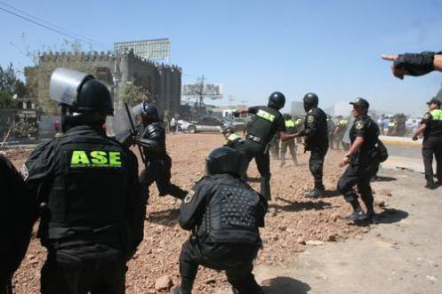 En el kilómetro 28.5 de la vía, con dirección a Puebla, los policías se abalanzaron por igual contra hombres, mujeres y niños, para lo cual utilizaron toletes, escudos y proyectiles de gases lacrimógenos. La gente respondió con piedras, palos y otros objetos.