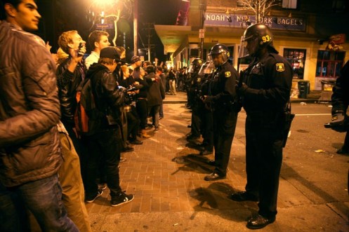 At 2:10 a.m., protesters appeared to have formed a line across Telegraph Ave. in the Durant Ave. intersection chanting « whose street, our street. » Police appeared to have formed a line opposite the protesters near Bank of America.