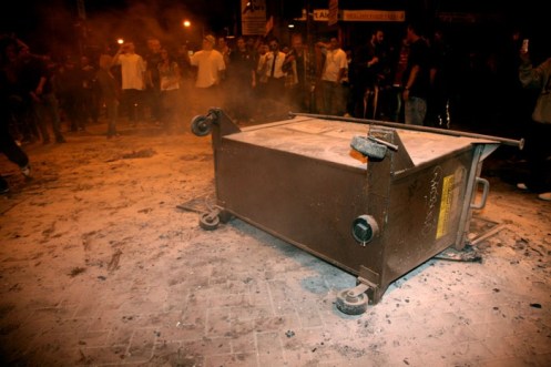 That’s when a full-out riot erupted. As officers pushed the crowd back so firefighters could get at the flaming garbage bin, protesters flung bottles and rocks at police, authorities said.