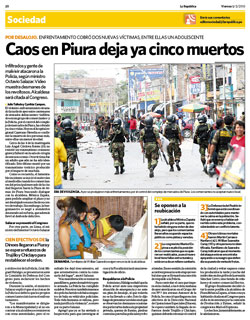 La policía de Piura dijo a Efe que los enfrentamientos han cesado hoy, pese a que aún persiste un clima de mucha tensión, además, no confirmó los dos últimos fallecimientos.