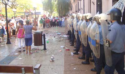 El movimiento piquetero reclamaba megáfono en mano, fuentes de trabajo y de golpe un estallido en las ventanas de la Casa de Gobierno provocó un disturbio descomunal, mientras que un grupo de mujeres golpeaban las puertas la Casa de Gobierno que estaba cerrada, los agentes que cuidaban la sede gubernamental, fueron contra ellas y todo se convirtió en un caos, los militantes trataron de impedir que golpearan a sus compañeras, y comenzó una especie de razzia, al rato llegó el GOE (Grupo de Operaciones Especiales) trató de persuadir a los manifestantes que se resistían a las detenciones, y el camión de bomberos repartía agua a diestra y siniestra.