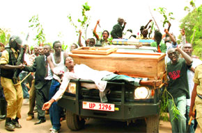 Earlier, the students had grabbed a coffin from the neighbouring Wandegeya and headed, while chanting university slogans, to pick the corpses of their colleagues from Mulago Hospital morgue. But the Police successfully intercepted them at Kubiri Junction.