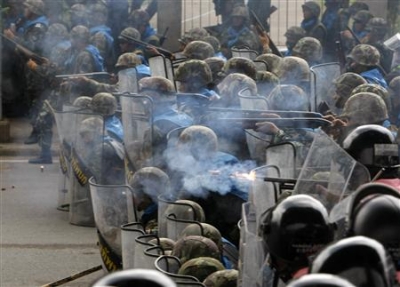 Plusieurs kilomètres en amont du cortège principal, une centaine de manifestants se sont violemment heurtés aux forces de sécurité, qui ont fait usage de balles en caoutchouc, de leurs matraques et de boucliers pour les disperser.