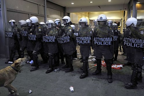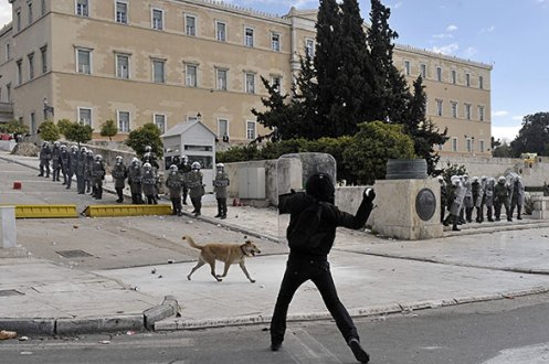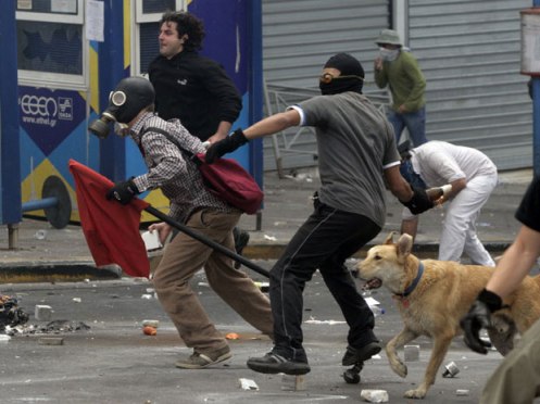 Though there are many weapons available to the street protester, there is perhaps only one for which there is no defense: A really cute friggin’ dog. After Kanellos the Greek protest dog shot to fame when the Guardian published a photographic profile piece dedicated exclusively to him, careful observers started to notice that, hey! There are a lot of dogs hanging with these Greek protesters and, they really seem to want to stick it to the man. True, the dogs’ presence may be due less to any burning desire to fight the power and more to the fact that, well, there are a whole lot of stray dogs in Athens. They can be easily mistaken for one another since they all wear the same collars, blue for boys and red for girls, which are provided by the city with tracking tags when the dogs are vaccinated and spayed or neutered. Here’s where they’ve been spotted in the past.