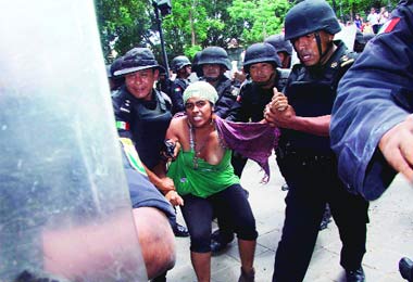 Oaxaca, Oax., 19 de julio. Unos 100 agentes de las policías estatal y municipal desalojaron a comerciantes vinculados con la Asamblea Popular de Pueblos de Oaxaca (APPO) del zócalo de la ciudad y de la Alameda de León, donde se instalaron por la mañana. Hubo dos heridos y ocho detenidos.
