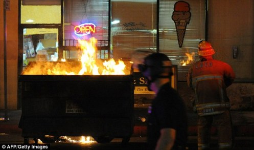 In Monday night’s violence, three officers were slightly injured by thrown objects and four people were arrested on suspicion of misdemeanor inciting a riot, Officer Bruce Borihanh said. Police said most of Monday’s trouble involved a group handing out revolutionary fliers.