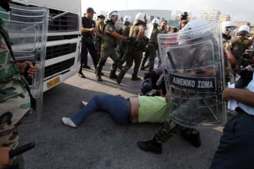 Riot police fired tear gas to disperse dozens of people who threw stones at trucks trying to enter ferries at the port outside Athens. No injuries or arrests were reported.