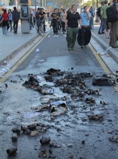 Los radicales la tomaron contra bancos y cajas, tiendas de ropa de cadenas como Zara o Levis -que fue saqueada-, arrasaron literalmente una tienda Movistar y quemaron contenedores a su paso. También se liaron a pedradas contra todo: fueran agentes antidisturbios, escaparates o el coche de una autoescuela. Todo ello para pavor de los centenares de turistas que disfrutaban del soleado día visitando el centro.