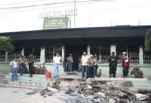 Frente a la Municipalidad aún podían observarse los restos de la batalla entre agentes y residentes; carros y motocicletas incendiadas que pertenecían a la PNC y a la Policía Municipal de Tránsito, uno de la mancomunidad y otro propiedad de un vecino, además de papelería y mobiliario de las entidades dañadas.
