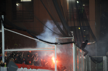 Both teams returned to the changing rooms ahead of the game’s scheduled start and were back onto the pitch after about 30 minutes as police confronted around 100 fans who damaged a protecting net, crashed plexiglas barriers and set off flares.