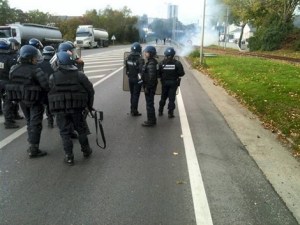 La situation devient très tendue à Lorient. Entre 300 et 400 manifestants font face aux CRS au port de Kergroise, à proximité du dépôt pétrolier, depuis plus d’une heure. Les forces de l’ordre usent de bombes lacrymogènes pour tenter de disperser les opposants. Il y aurait au moins trois blessés dont un vieux monsieur de 77 ans qui a été pris d’un malaise. Des personnes sont couchées à terre. des traces de sang sont visibles. Les CRS n’auraient pas utiliser leurs matraques, ni leurs flashballs. Les blessures seraient dues aux seules bombes lacrymogènes qui auraient touché directement certains manifestants avant leur déclenchement. A 13 h, le face-à-face se poursuivait dans une ambiance électrique.