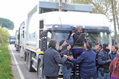 I manifestanti hanno tentato di impedire di far uscire i camion dal sito di stoccaggio.