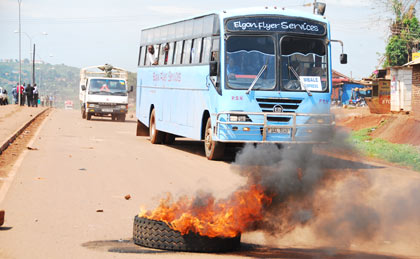 A policeman firing teargas canisters at rioting residents in Bugembe town council yesterday.MORE…
