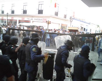 Autoridades estatales y municipales usaron por lo menos en tres ocasiones gas lacrimógeno para repeler las protestas de integrantes de la comunidad Santos Reyes Nopala, quienes intentaron plantarse en el primer cuadro de la ciudad. Policías evacuan el zócalo oaxaqueño.
