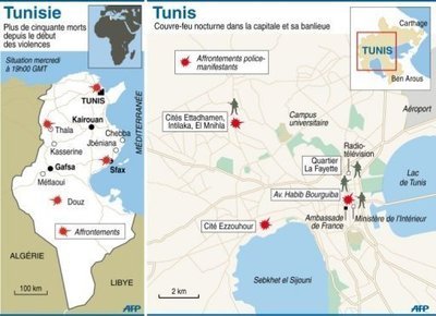 A Soliman, une ville côtière située à une quarantaine de kilomètres au sud-est de Tunis, des témoins ont fait état de la mort de deux jeunes gens tués par des policiers lors d’affrontements devant un commissariat de police. Dans la ville de Sidi Bouzid, d’où sont partis les troubles, plusieurs milliers de personnes auraient défilé dans les rues.