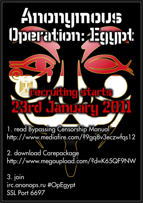 La restriction de l’accès à Facebook et Twitter en Egypte n’a pas tardé à titiller les hacktivistes du collectif Anonymous. Ils ont répondu par une « Operation Egypt », similaire à celle menée contre la Tunisie, visant à faire tomber les sites gouvernementaux.