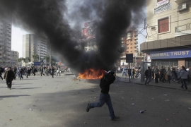 A man runs past a torched vehicle during a demonstration in support of the caretaker prime minister Saad Hariri in the Sunni bastion coastal city of Tripoli on Jan. 25, 2011. (Joseph Eid/AFP/Getty Images)