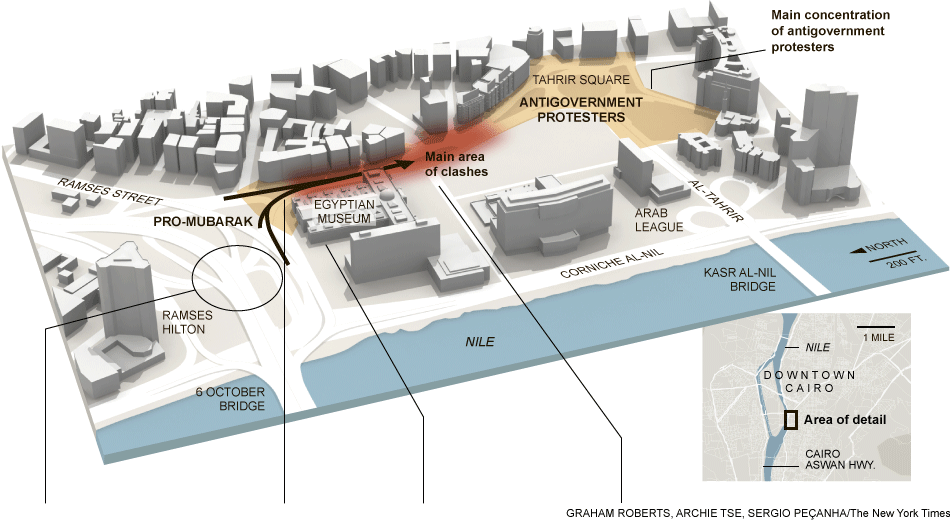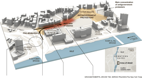 5 heures. Des tirs en provenance du pont d’Octobre, où sont positionnés les partisans du président Hosni Moubarak, auraient fait de nombreux blessés. La mort de deux manifestants est confirmée. Selon des témoins, des policiers en civil se trouvent parmi les partisans du président égyptien.