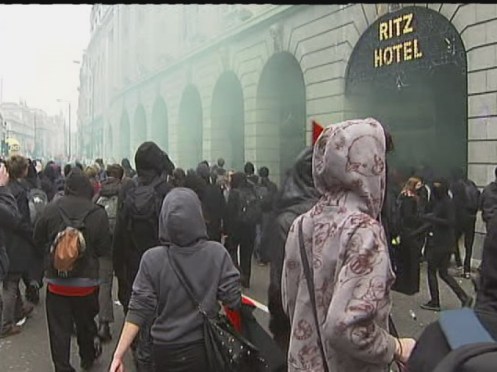 Clothes store Topshop and bank HSBC had their windows smashed, while some protesters hurled missiles at London’s landmark Ritz Hotel. Others lit a bonfire at Oxford Circus, in the heart of the shopping district.