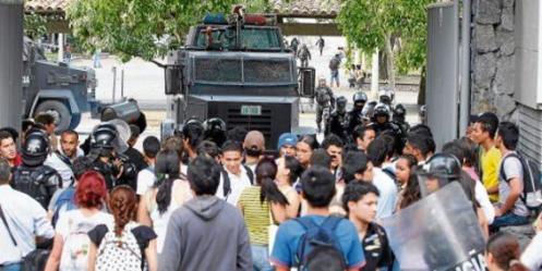 Pasadas las 2:00 p.m., justo cuando los estudiantes terminaban una asamblea en el Teatro al Aire Libre., comenzaron a sonar explosiones de papas bombas y hombres del Escuadrón Antidisturbios, que están siempre afuera de la institución, ingresaron acompañados de tres tanquetas.