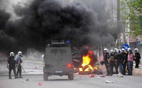 Thousands of Kurds had taken to the streets earlier, throwing firebombs and stones at police during the funeral of a protester killed the day before during demonstrations over the banning of the Kurdish candidates.