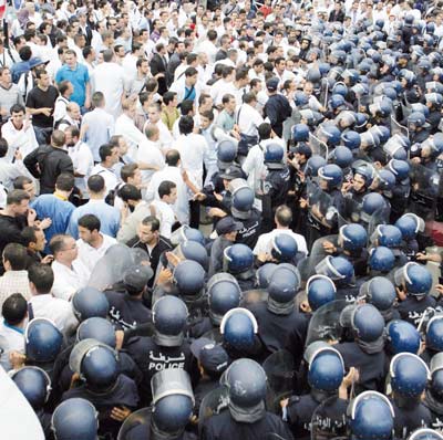 La place du 1er Mai a connu, hier, un long après-midi où des forces antiémeute ont réprimé la manifestation des médecins grévistes avec une violence inouïe. Des centaines d’agents antiémeute vont et viennent en frappant sans retenue, des casques bleus armés de boucliers donnant des coups de godasse à tout-va, des camions-canons à eau postés à l’entrée de l’hôpital Mustapha en guise de menace extrême et des citoyens choqués observant la démonstration de force de cette police qui franchissait à ce moment même une nouvelle étape dans ses stratégies de répression.