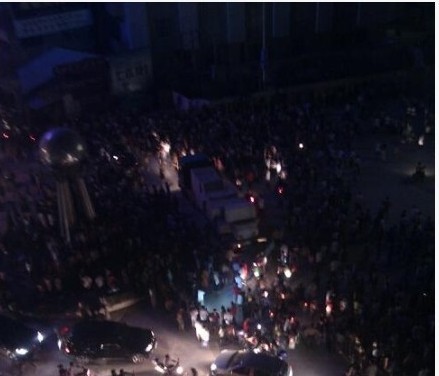 网上流传的古巷镇聚集事件的图片。当时有很多人聚集在派出所门口,多辆汽车被推翻在地,派出所大门遭损坏。