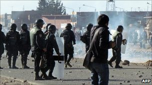 Violence in the Puno region started when about 1,000 people were prevented from breaching a security fence around the international airport in Juliaca.