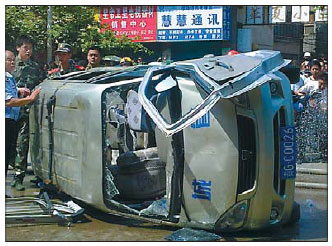 According to a video clip uploaded onto the youku.com website by an unidentified netizen, a vehicle with the sign « 12319 » on it, the local phone number of chengguan, was destroyed and turned over in the middle of the road. Many police officers were trying to break up the angry crowd.