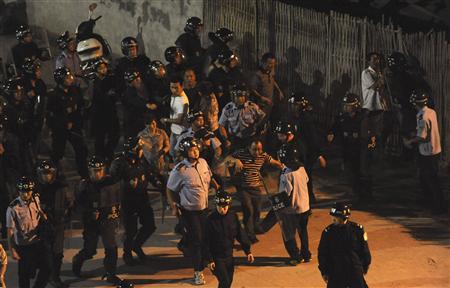 Riot police broke up a four-day protest by several hundred villagers in Haining, Zhejiang province, who overturned cars and stormed the compound of a photovoltaic manufacturer that is accused of releasing toxins into a local river.