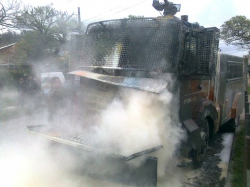 Hace unos momentos Carabineros intento ponerle fin a este conflicto con un carro lanza agua que intentó traspasar la barrera que está en el Puente del estero Longuén. Sin embargo, el carro recibe una bomba molotov en su parte delantera, dejando inutilizable el vehículo por unos momentos. Mas…
