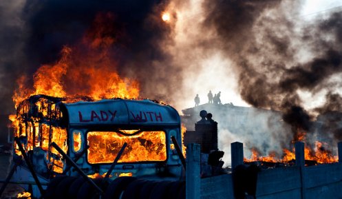 An activist holds up a crucifix as a barricade burns during evictions from Dale Farm. Photograph: Peter Macdiarmid/Getty Images