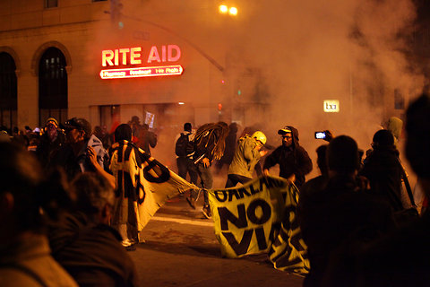 After the Occupy Oakland encampment was torn down early Tuesday morning by police, the ousted protesters reconvened outside the Oakland Library on Tuesday afternoon and voted to attempt a re-occupation of the same plaza from which they had just been evicted. Summoned by waves of emergency tweets and emails, fresh recruits joined the evicted Occupiers and early this evening once again marched on downtown Oakland, intending to reclaim Frank Ogawa Plaza. But the Oakland Police were of course monitoring all this, and along with many other local police departments they were waiting for the protesters’ invasion. After an hours-long standoff at 14th and Broadway, interrupted by several confrontations and arrests, everything started to turn violent some time after 9:30pm.