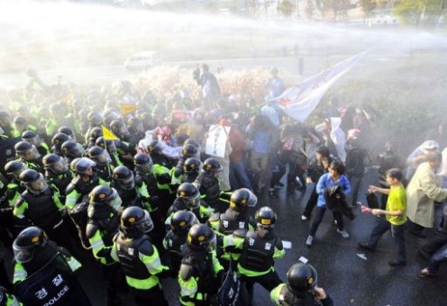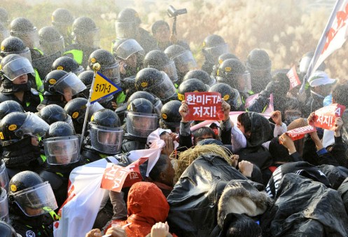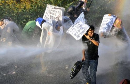 SEOUL — South Korean police fired water cannons Thursday to disperse demonstrators who tried to force their way into parliament in a rally against a free trade agreement with the United States.
