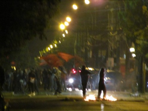 Mientras continúa desarrollándose la reunión de los dirigentes de la Confech al interior del centro de extensión de la Universidad del Bío-Bío en Chillán, en la calles Constitución y Libertad cerca de 10 jóvenes levantan barricadas y queman neumáticos.