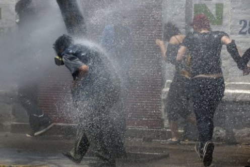 Chilean police used tear gas and water cannon against a group of protesters who covered their faces and hurled rocks and bottles. About 20 protesters were arrested.
