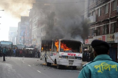 At least five vehicles, including a police jeep, were set on fire in central Dhaka during Sunday’s violence, United News of Bangladesh news agency reported.