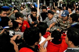 The demonstrators, from Muhammadiyah University, attacked police after the law enforcers tried to prevent the protestors from forcing a civil servant out of an office car that the students had halted at a road block they had set up. The attack was sparked after one of the police officers hit a student in the tussle.