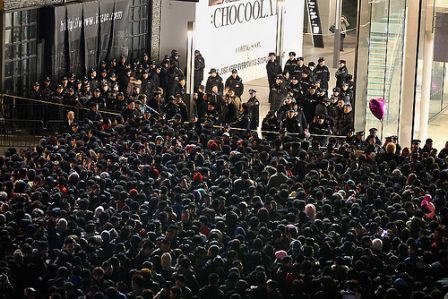 Forcément, dans une foule immense, après une longue attente, et après l‘intervention des équipes de sécurité, la file s’est transformée en émeute, car l’Apple Store ne voulait pas ouvrir ses portes. Les oeufs ont donc volé, les insultes ont fusé, mais aucun iPhone 4S n’a été acheté. En effet, l’Apple Store est resté fermétoute la journée, et des équipes de nettoyage s’occupent en ce moment même de nettoyer le lieu de l’attroupement. Lire la suite…