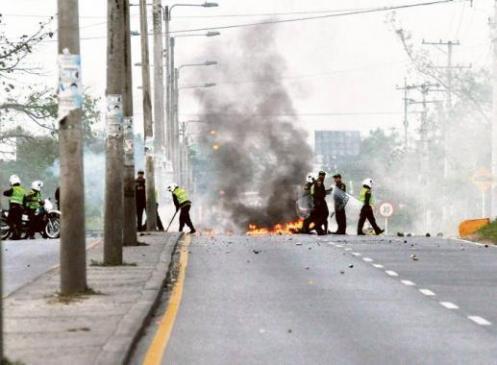 Los uniformados fueron golpeados con piedras por parte de los protagonistas del desorden iniciado a eso de las 5:00 de la tarde a la altura de la Carretera Troncal de Occidente.