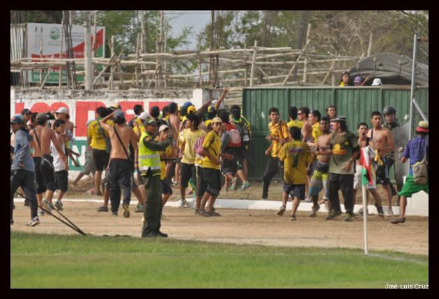 Por varios minutos los fanáticos de ambos equipos se enfrentaron a piedra y otros objetos contundentes, pero la policía logró controlar la situación en la parte interior del estadio, pero luego los sucreños salieron para reiniciar la trifulca.
