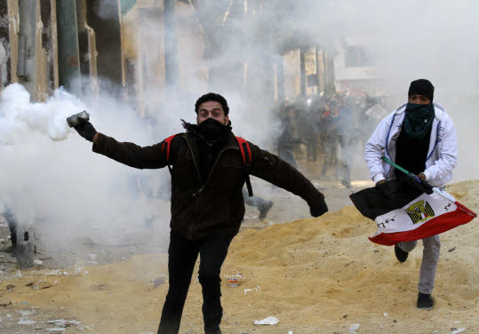 An Egyptian protester runs to throw tear gas during a protest in Tahrir Square on January 25, 2013 in Cairo. Huge crowds are expected to demonstrate in Egypt on the second anniversary of the revolution that ousted Hosni Mubarak and brought in an Islamist government, as political tensions simmer and economic woes bite. AFP PHOTO/MOHAMMED ABED